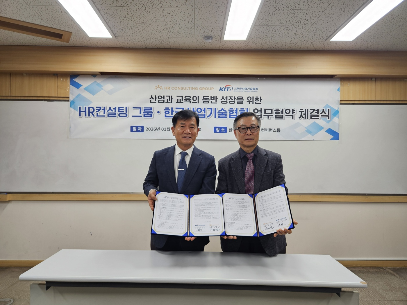□ 사단법인 한국산업기술협회(원장 최명기)와 (주)HR컨설팅그룹(대표 이병민)은 2026년 1월 12일, 기업 고객 지원과 인적자원개발 분야의 협력 시너지 창출을 위한 업무협약(MOU)을 체결했다고 밝혔다.
